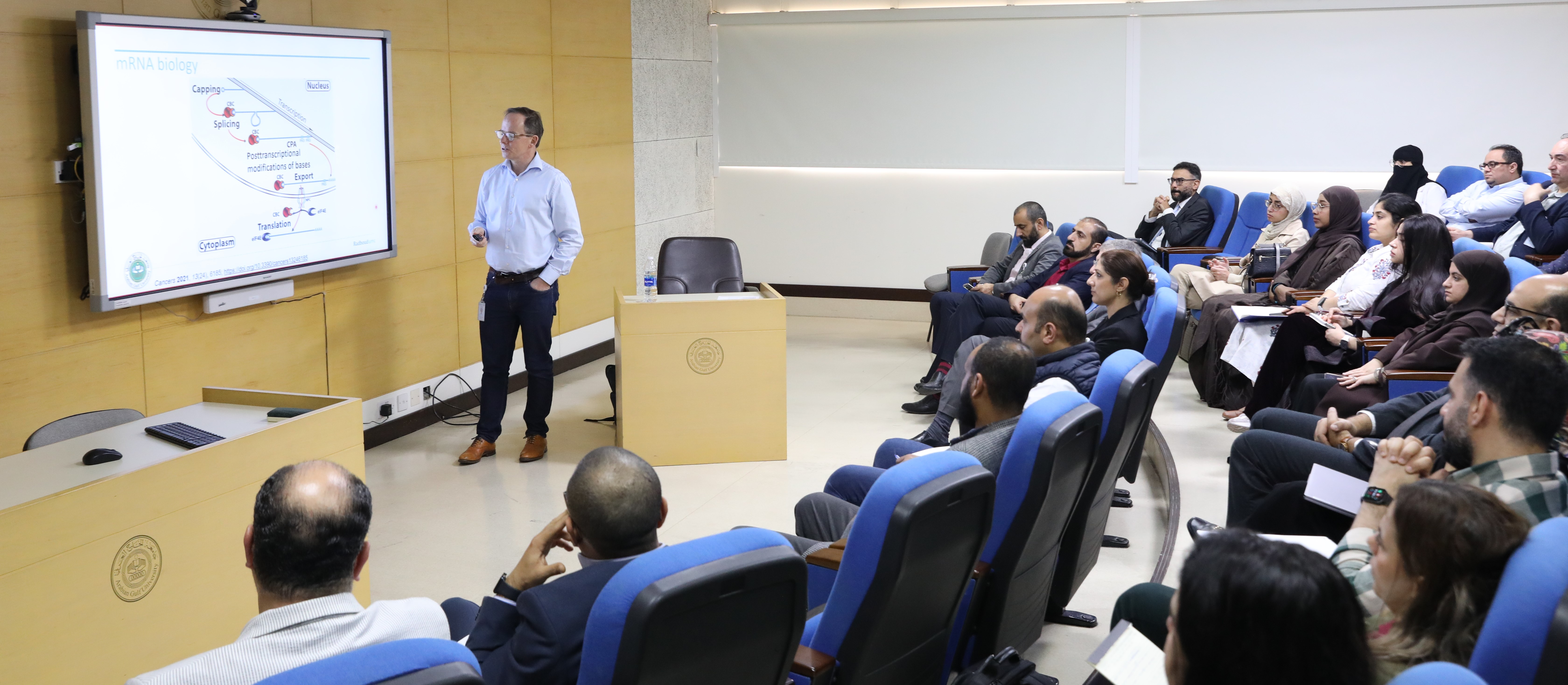 استضاف كرسي سمو خادم الحرمين الشريفين الملك فهد بن عبدالعزيز آل سعود للعلوم التقنية الصحية أستاذ الكيمياء الحيوية في جامعة رادبود بهولندا، الأستاذ الدكتور رولاند بروك، وهو أستاذ منتدب بقسم الكيمياء الحيوية في كلية الطب والعلوم الصحية بجامعة الخليج العربي، لتقديم محاضرة علمية وورشة عمل حول "علاجات الحمض النووي الريبي (RNA): من العلوم الأساسية إلى التطبيقات السريرية".