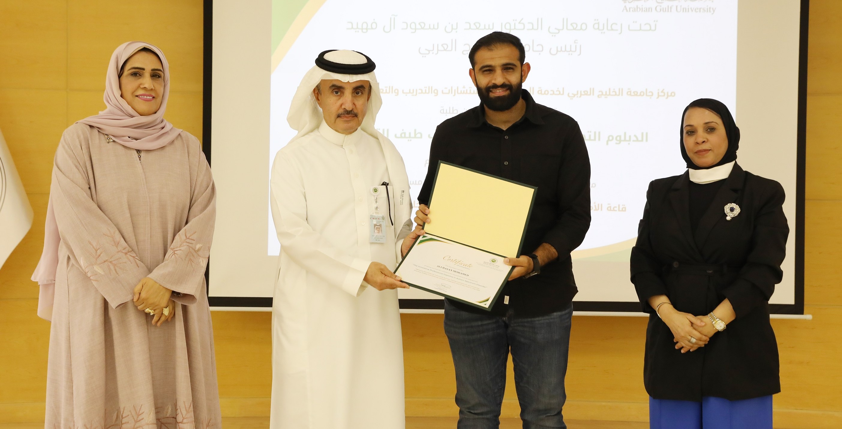احتفلت جامعة الخليج العربي بتخريج الدفعة الأولى من طلبة الدبلوم التطويري المبتكر في اضطراب طيب التوحد، الذي انطلق وفق اتفاقية بين جامعة الخليج العربي، والجمعية البحرينية للإعاقة الذهنية والتوحد، وبدعم من تمكين. حيث تم تصميم البرنامج لتأهيل وتطوير مهارات المعلمين والمعلمات والإداريين المنتسبين للجمعية البحرينية للإعاقة الذهنية والتوحد.